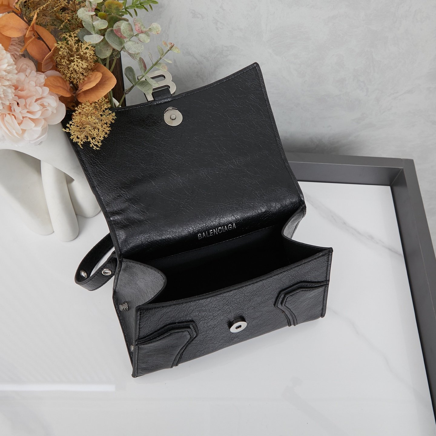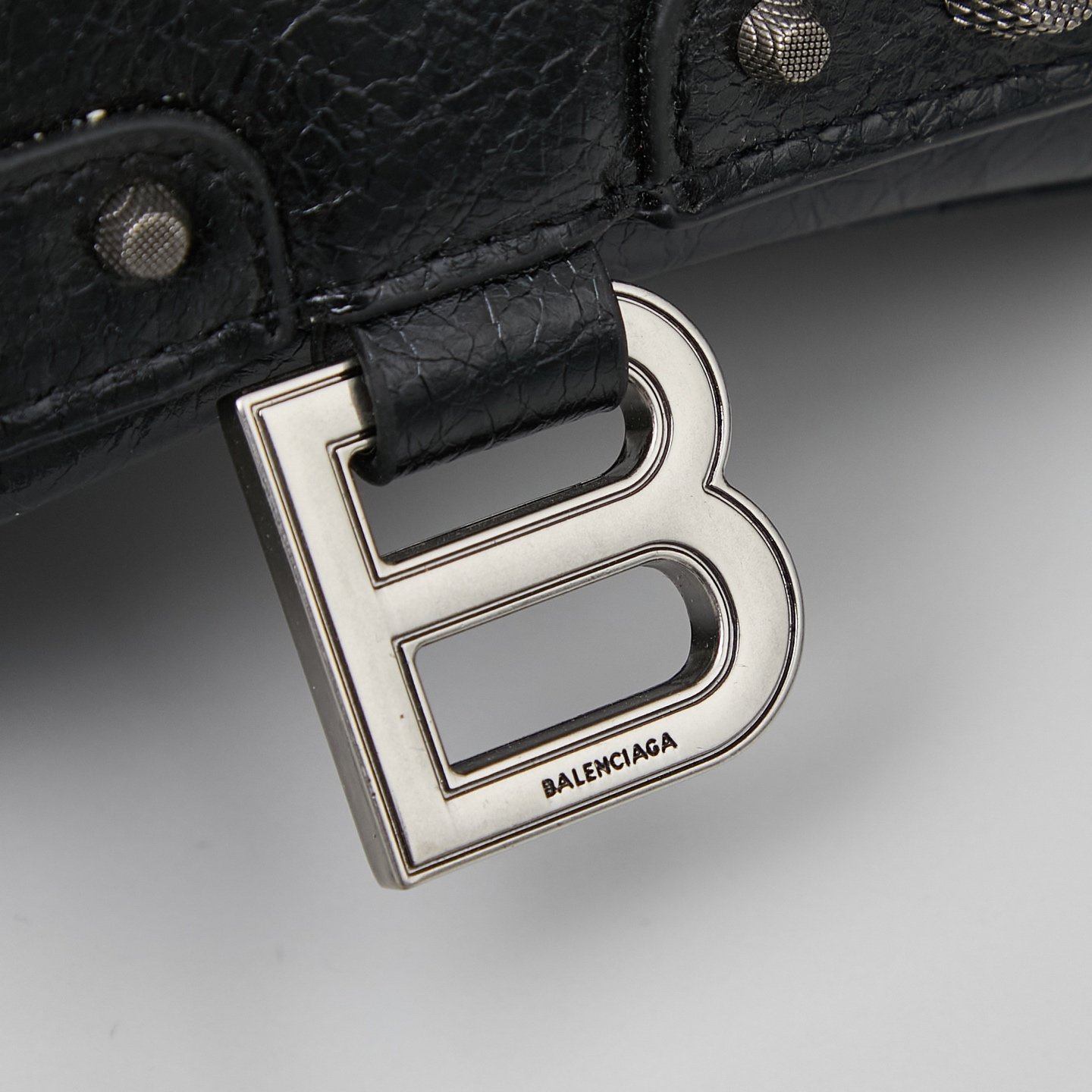 Small size, with box, motorcycle hourglass bag|||Balenciaga motorcycle hourglass bag. Have you heard of the collaboration between Balenciaga’s hourglass and motorcycle bag? Look at this combination of Hourglass bag and Le Cagole #motorcycle bag#. The hourglass bag body is covered with rose studs of the motorcycle bag. Black Arena lambskin is full of punk style. Quite interesting. Size: 23x16x10.
