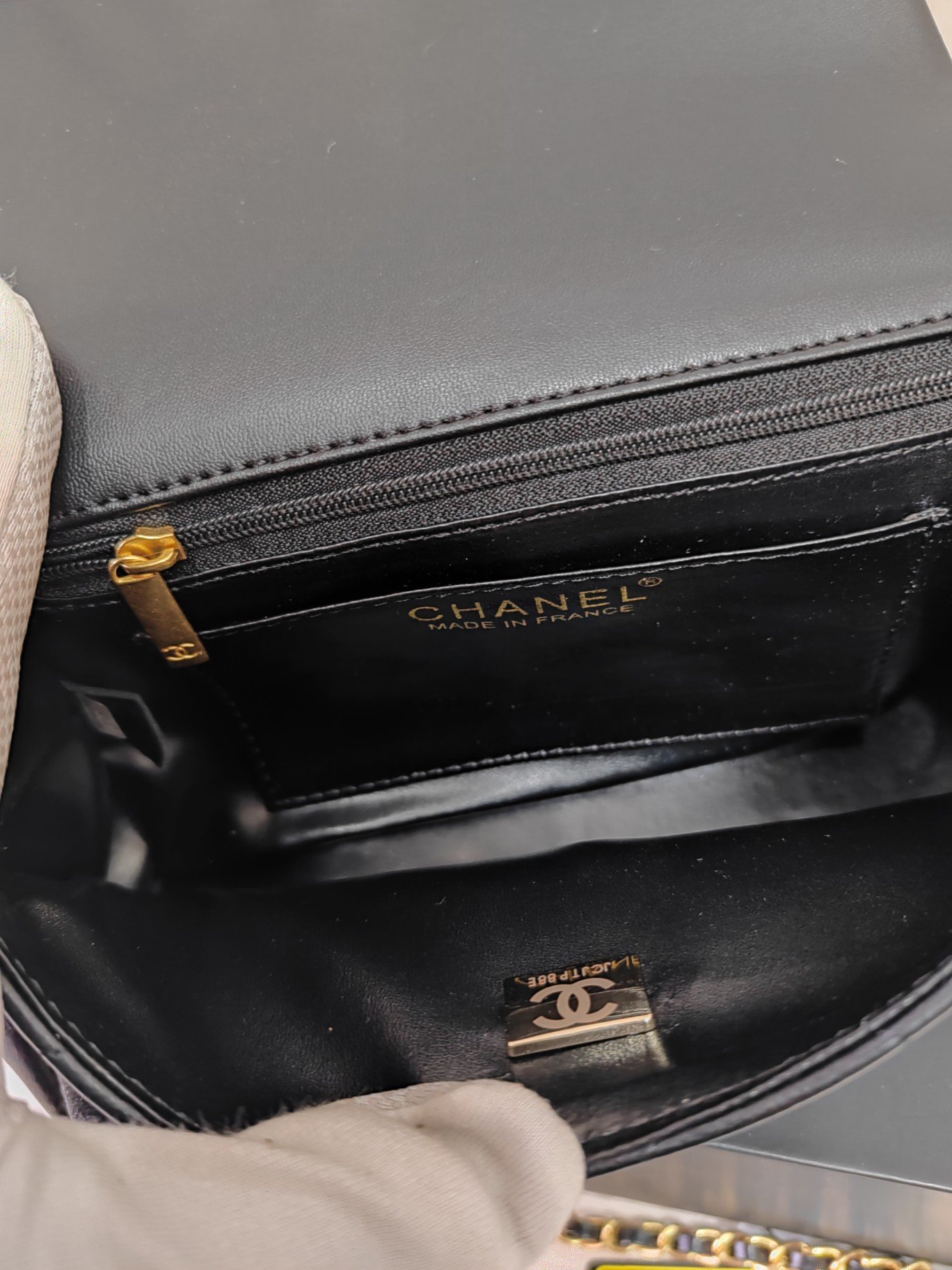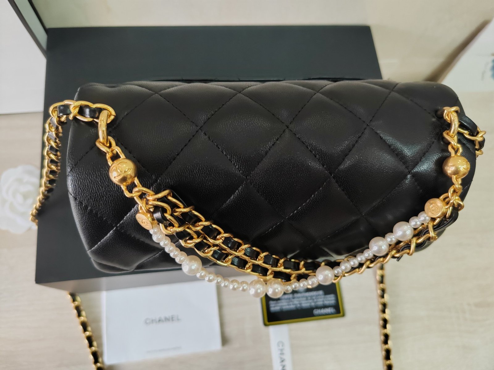 Chane1🧩 Spring/Summer Series 24P pearl chain mini AS4384. The pearl chain and the overall black and gold color scheme are more elegant and noble. This square mini is so beautiful. It can also be carried by hand. It is really amazing and special when worn. It is small, delicate and the physical object is extremely beautiful.