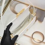This Miss Dior flap handbag is a new product of the 2024 winter ready-to-wear collection, reinterpreting the modern elegance of Dior’s classic styles. Exquisitely crafted from milky white quilted cowhide leather and adorned with the classic Miss Dior Allover pattern of this series, inspired by the Dior design archives of Marc Bohan, and newly interpreting the fashion style of the 1960s in a modern style. Paired with a contrasting retro gold-finished fashionable metal plaque decorated with the Miss Dior logo, it showcases a timeless aesthetic style. Under the flap, the main compartment has a zipper pocket for easy storage of various daily necessities. With an adjustable strap, it can be carried on the shoulder to create a fashionable look exuding haute couture style.