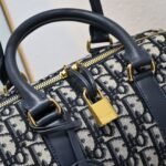 This Dior Groove .25 handbag, part of the winter ready-to-wear collection designed by Maria Grazia Chiuri, is both elegant and stylish. Crafted from blue Oblique-patterned fabric, it features a leather key pouch adorned with the Christian Dior Paris logo and embellished with gold-tone star accents. The key opens the zip-lock closure, and the spacious compartment includes a slip pocket and a zip pocket, perfect for storing daily essentials. It comes with a leather top handle and an adjustable, detachable shoulder strap, allowing you to carry it by hand, over the shoulder, or crossbody, making it ideal for everyday looks. The zip closure is complemented by a lock engraved with the Christian Dior Paris logo. The leather key pouch, featuring the Christian Dior Paris logo and vintage gold-tone metal stars, comes with a key. Large size: 25 cm.