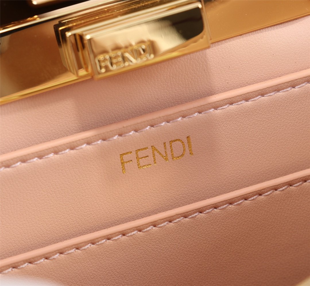 AAAAA grade, top quality. Fendi. Iconic Peekaboo ISeeU small handbag in black leather with classic twist locks on the sides. Pink and brown soft nappa leather lining with two compartments separated by hard baffles with buckle-down interior pockets and gold metal pieces. Handbag with handle and adjustable, removable shoulder strap for hand, shoulder or crossbody.