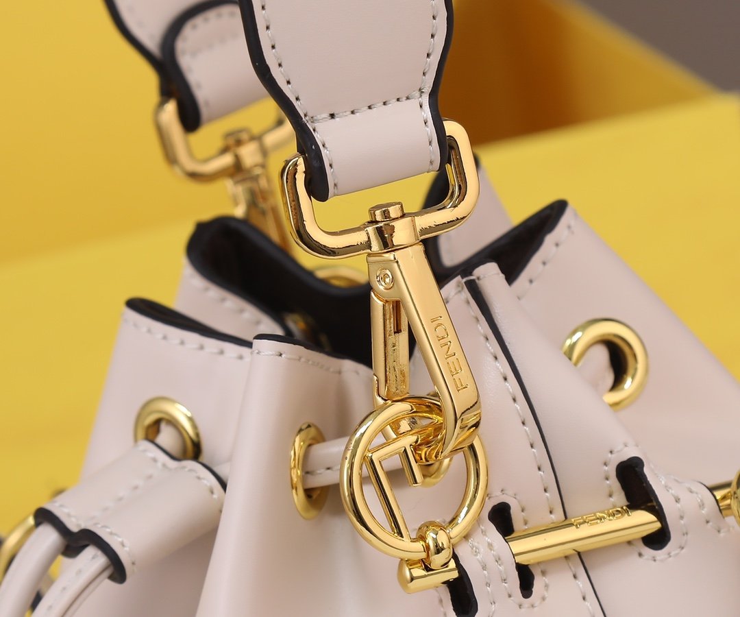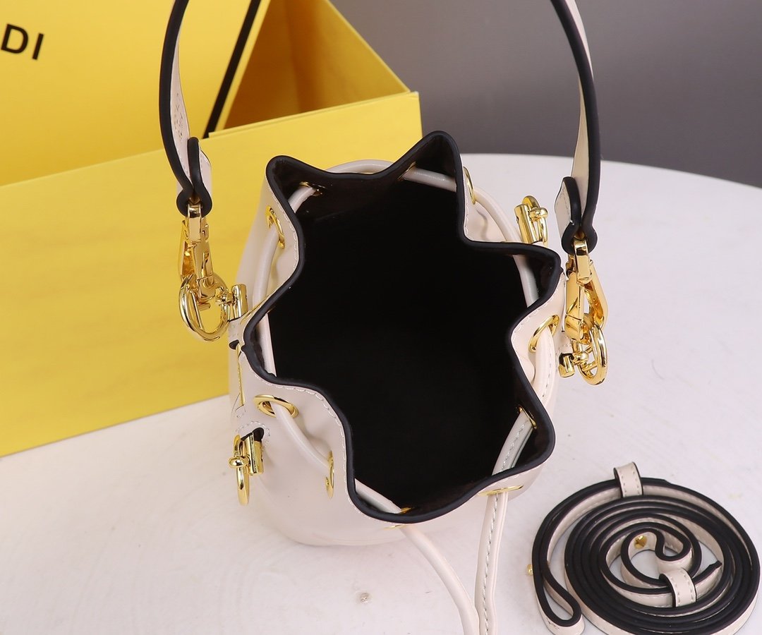 New F END1 Mon tresor bucket bag. The small bucket bag can be worn diagonally on the shoulder and serve as a decoration. Compared to the maturity of the classic double F, this small white bag with a large logo is even more simple and versatile! Model: 889200. Size: 18x12x10cm.