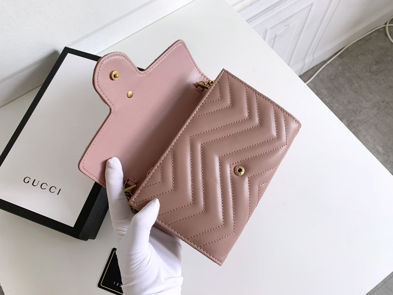 [G] 🔥🔥🔥 The Marmont mini chain bag features a rather structured soft shape.👏🏻 The flap is equipped with retro golden double G hardware.😍💋 The back is decorated with double G embroidery.🌹 It is made of quilted human-shaped Italian leather.👏🏻 Structured soft shape.👏🏻 Model: 47457520. Size: w20×h13×d6.