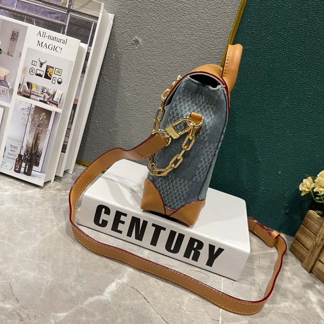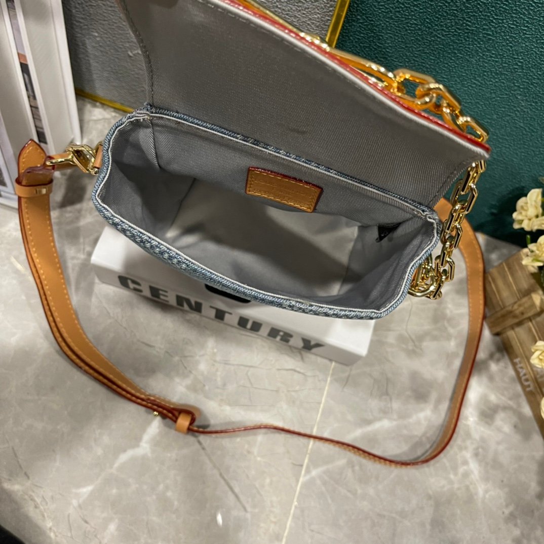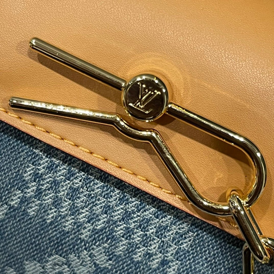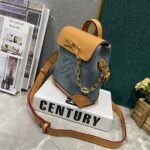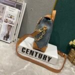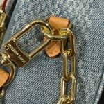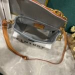 The handbag is from the brand’s collaboration series with Tyler. It presents a pocket-sized version of the Steamer handbag in Monogram Craggy canvas. The artist gives the Monogram pattern a hand-painted look. Cowhide leather shapes and reinforces the corner guards, shoulder strap, and flap.
