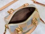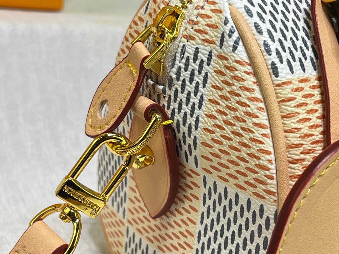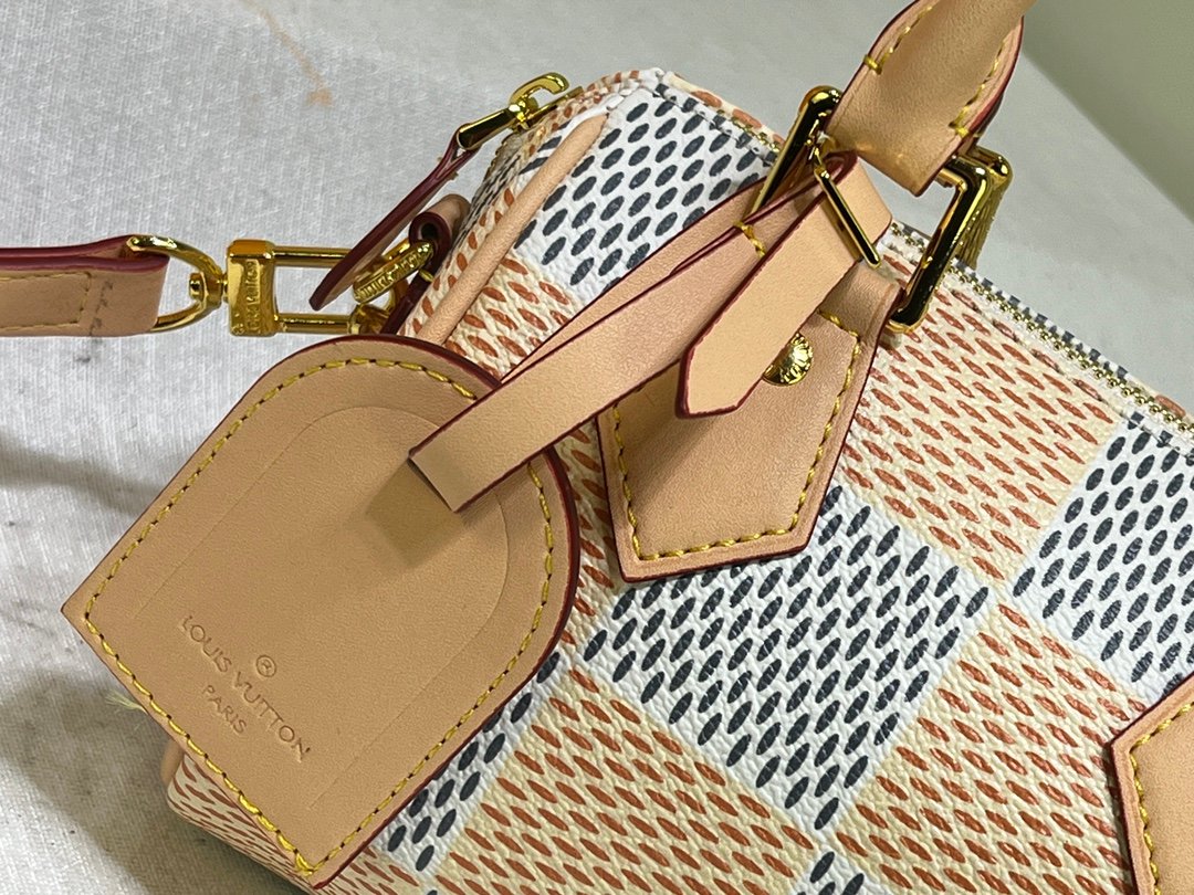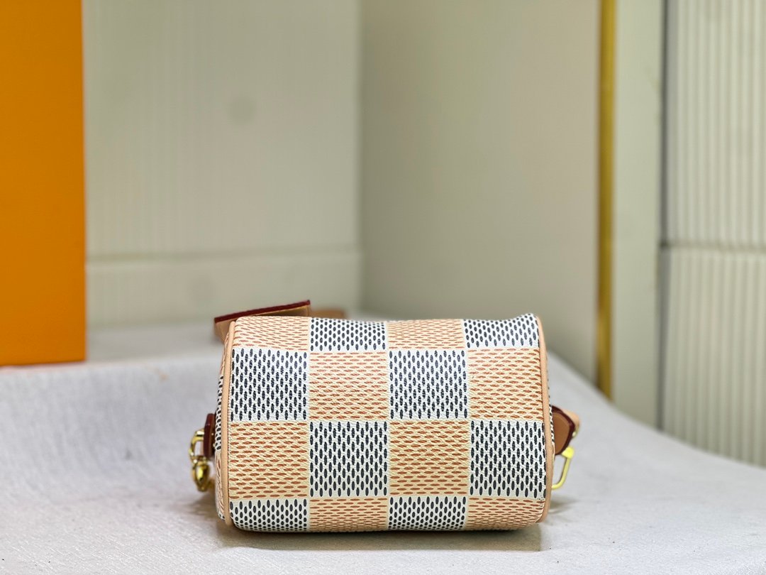 The handbag interprets the Speedy handbag of the 1930s with an exquisite design. It uses the Damier Pop coated canvas created by creative director Pharrell Williams to outline the classic lines and renders bright colors for the Damier checkerboard pattern. Size: 18x12x10cm.