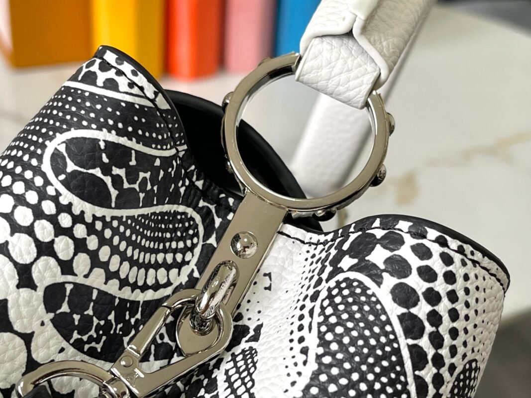 M21727 Louis Vuitton x Yayoi Kusama introduces this LV x YK Capucines BB handbag, inspired by the Japanese artist’s Infinity Net series of paintings created since 1959. Magnificent colors depict psychedelic patterns on the surface of Taurillon leather, conveying Yayoi Kusama’s accurate control of abstract space and conceptual vision, creating a collection of artistic whims.Detailed features27 x 18 x 9cm