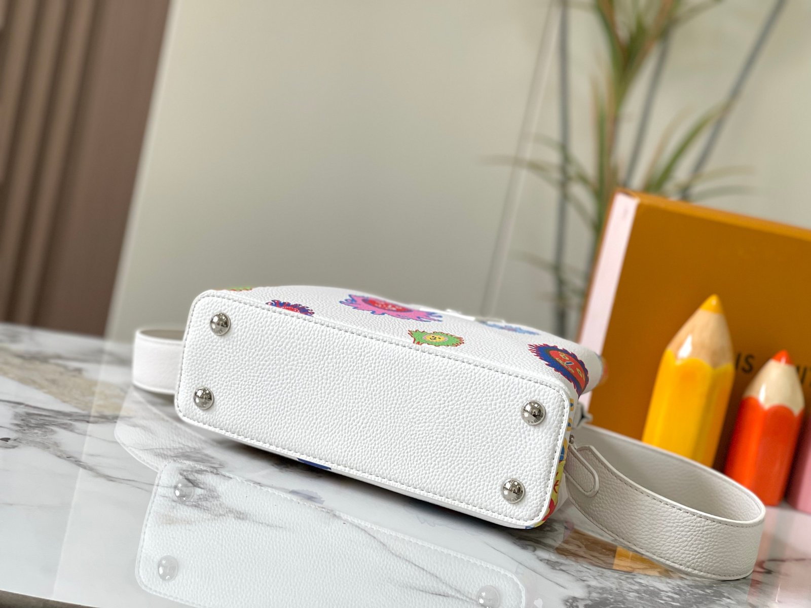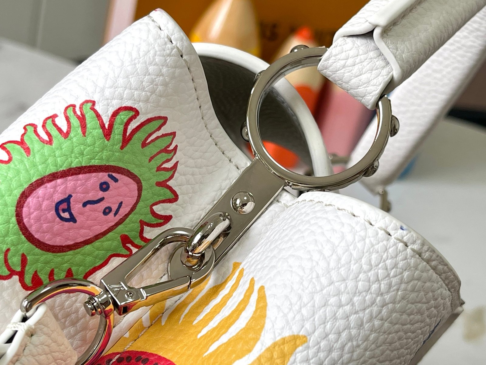 M21727 Louis Vuitton x Yayoi Kusama introduces this LV x YK Capucines BB handbag, inspired by the Japanese artist’s Infinity Net series of paintings created since 1959. Magnificent colors depict psychedelic patterns on the surface of Taurillon leather, conveying Yayoi Kusama’s accurate control of abstract space and conceptual vision, creating a collection of artistic whims.Detailed features27 x 18 x 9cm