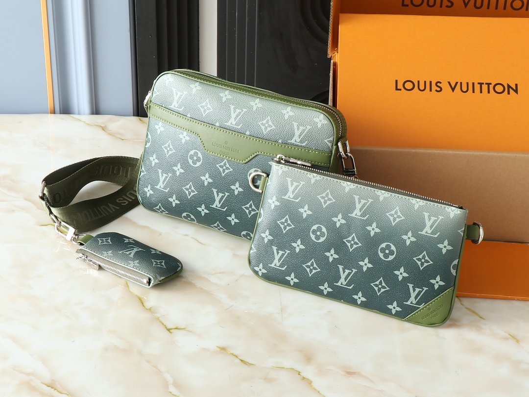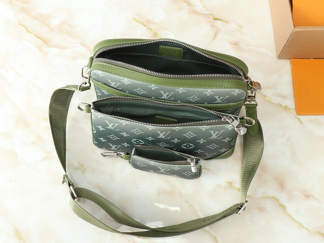 Upgrade the original M11648, M11645, M24754, M46603, M46602, M46604, M69443. This Trio messenger bag is made of Monogram embossed cowhide leather. The small coin purse on the front zipper pocket and shoulder strap is detachable. Together with the main compartment, it enriches the functional design. The detachable and adjustable jacquard fabric shoulder strap is marked with the brand logo, providing a comfortable shoulder and crossbody experience. Size: 25×18.5×7cm.