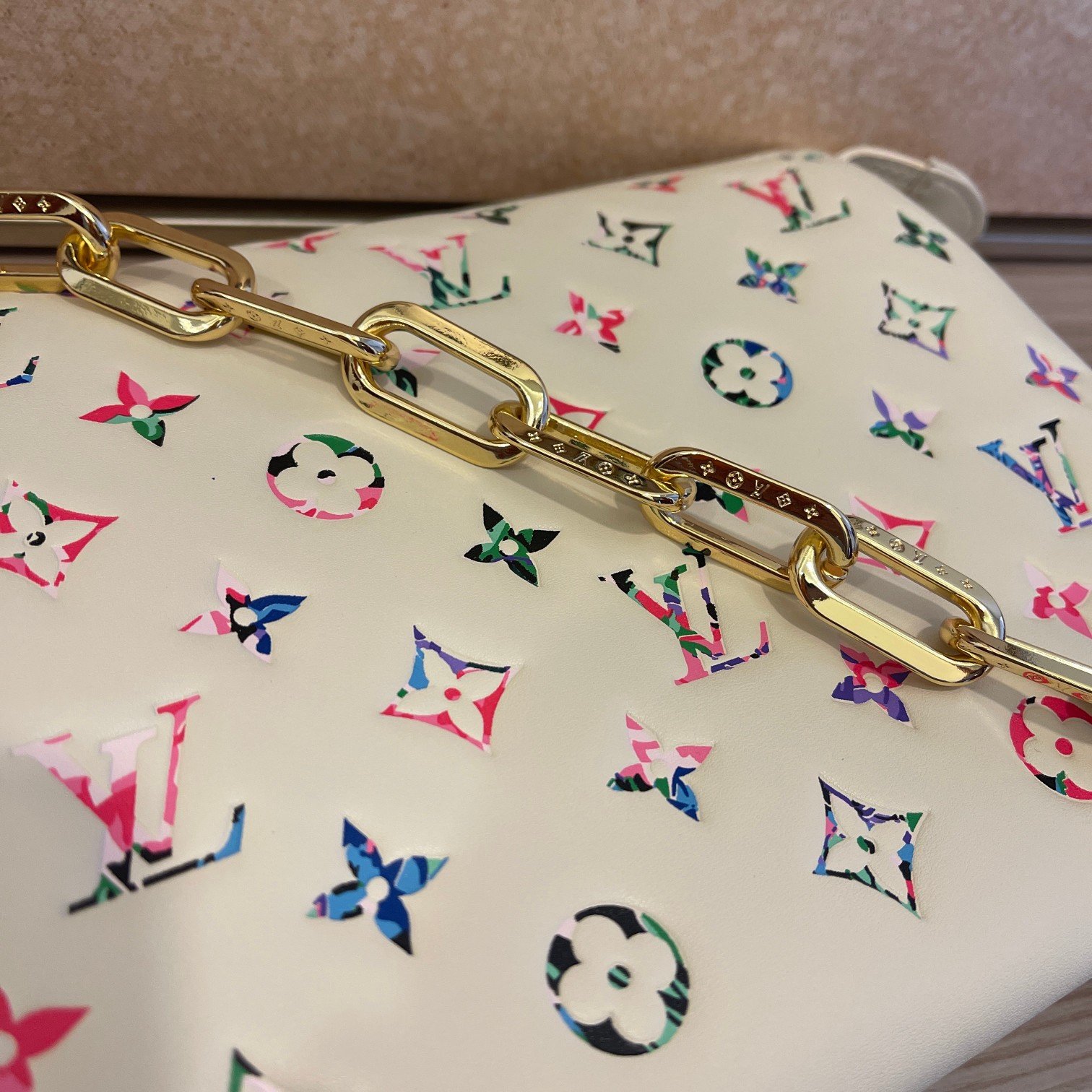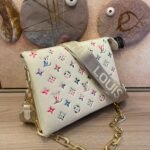 The top-of-the-line original M57793 57790 apricot Coussin small handbag shines at the Spring/Summer 2021 fashion show. Monogram embossed fluffy sheepskin creates a pillow configuration that injects avant-garde style into the minimalist design. Can be carried under the arm with a strap crossbody or an avatar chain baguette bag. Dimensions: 26 x 20 x 12 cm