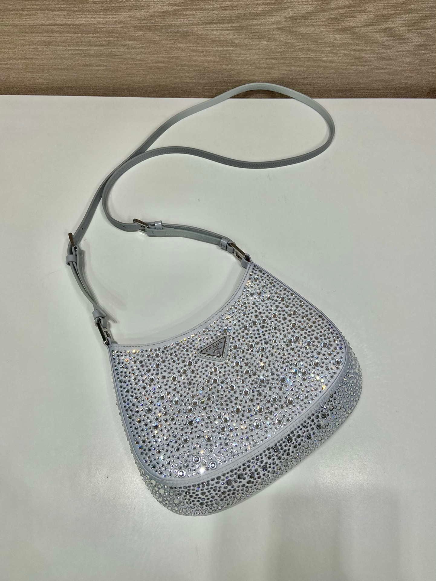 Feminine. elegant and modern. the Prada Cleo bag is made of satin and embellished with luminous crystals of different sizes that give the bag refined charm. The sinuous shape that recalls archive styles makes the accessory iconic.