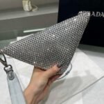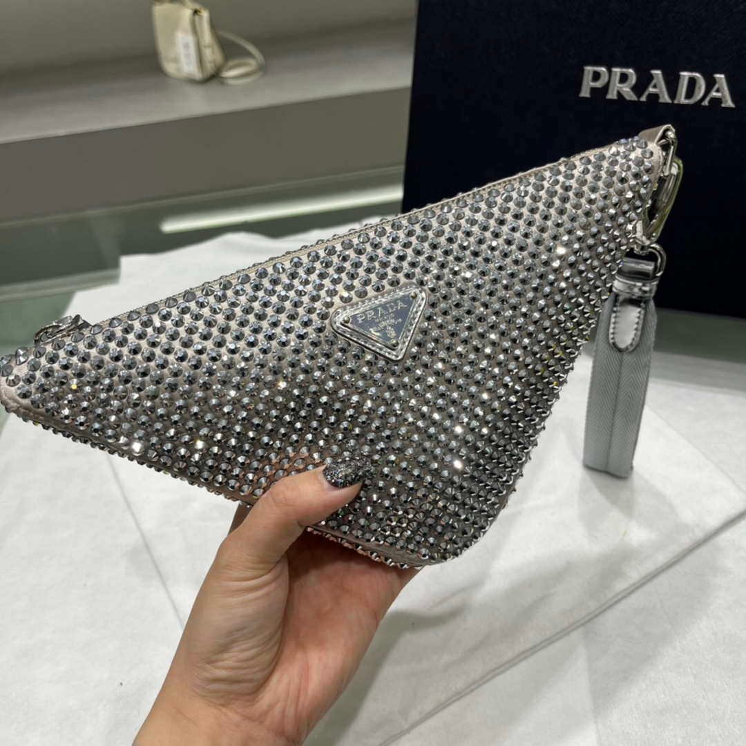 An all-over crystal embellishment creates plays of light and iridescent glimmers. A study on the triangle inspires new geometric shapes and novel interpretations of Prada’s iconic symbol. The triangular shape inspires the design of this satin pouch with an adjustable leather handle.