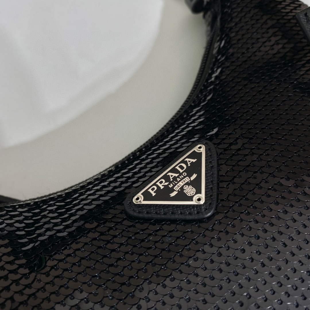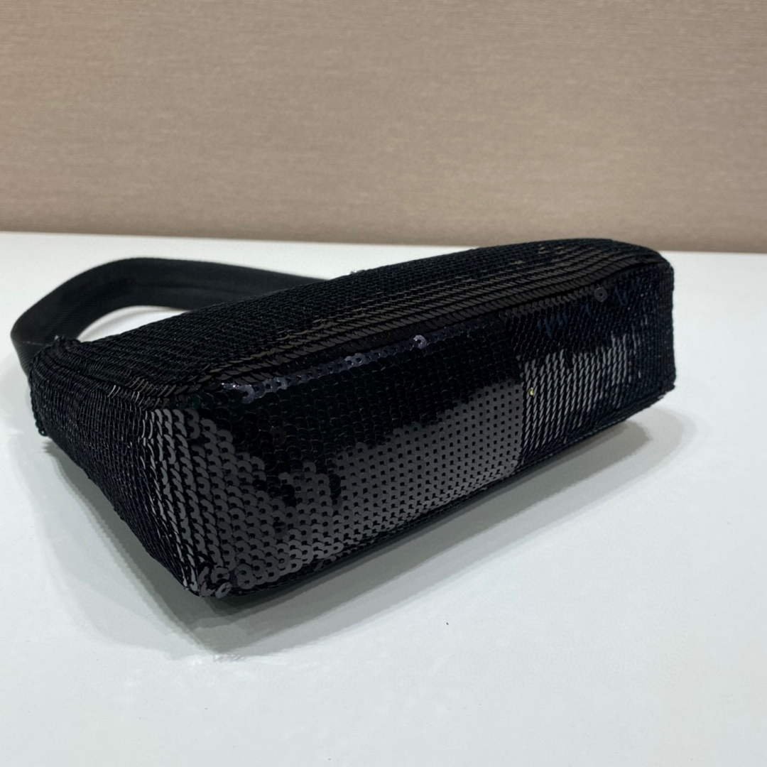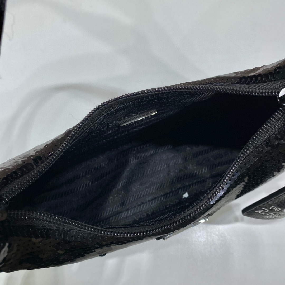A new interpretation of an iconic Prada style. the Re-Edition 2000 mini-bag is covered with all-over sequins that create a play of light and iridescent glimmers on the surface. The design is made of innovative Re-Nylon. produced from recycled. purified plastic materials collected in the ocean. fishing nets. and textile fibers. The accessory with zipper closure and woven tape handle is enhanced with the distinctive enameled metal triangle logo.
