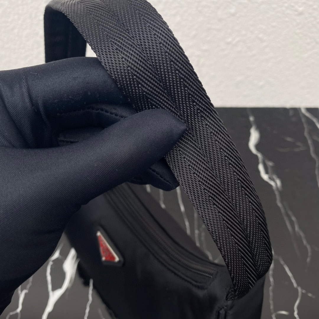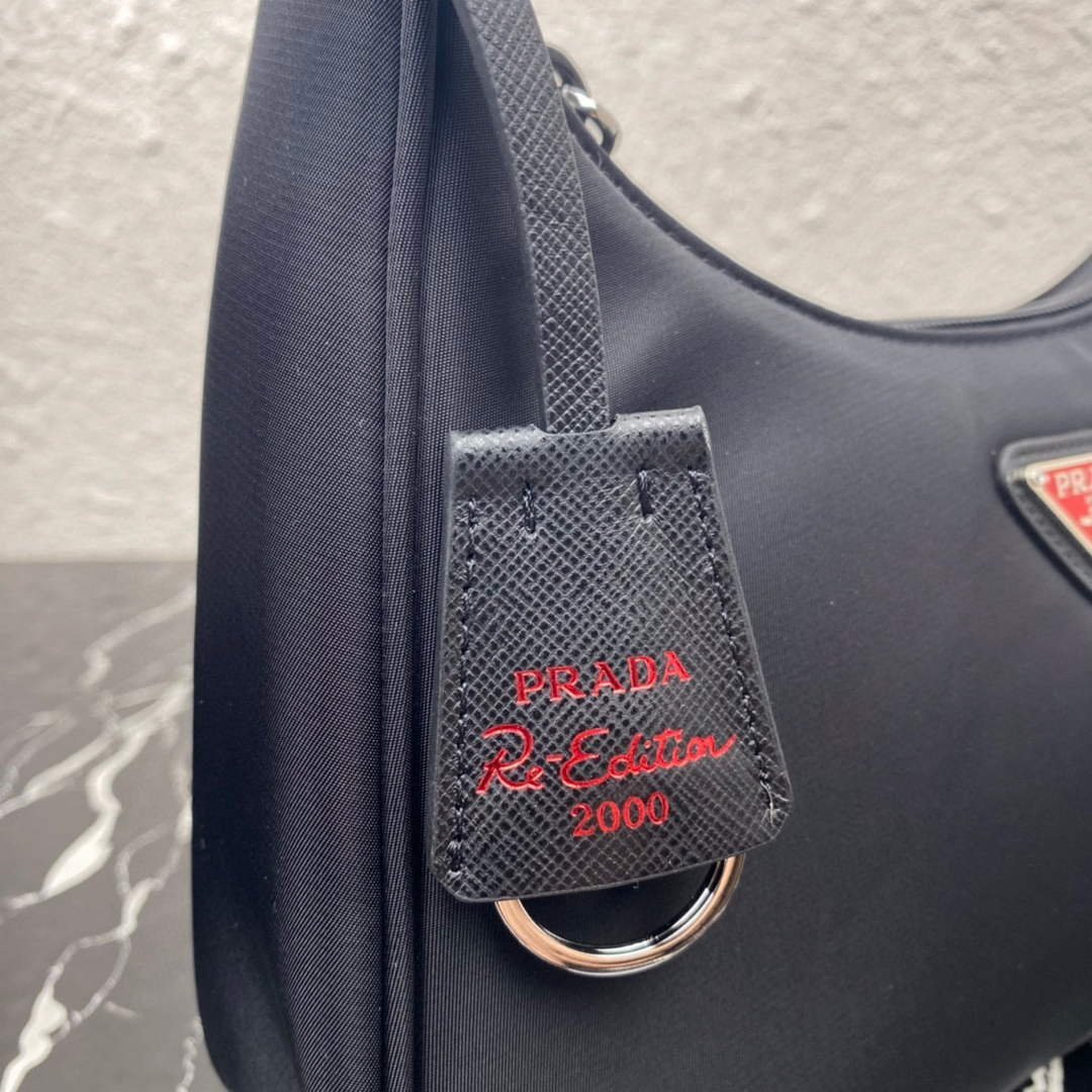 A new interpretation of an iconic Prada style. the Re-Edition 2000 mini-bag is made of innovative Re-Nylon. produced from recycled. purified plastic trash collected in the ocean. fishing nets. and textile waste fibers. The accessory with zipper closure and woven tape handle is decorated with the iconic enameled metal triangle logo.