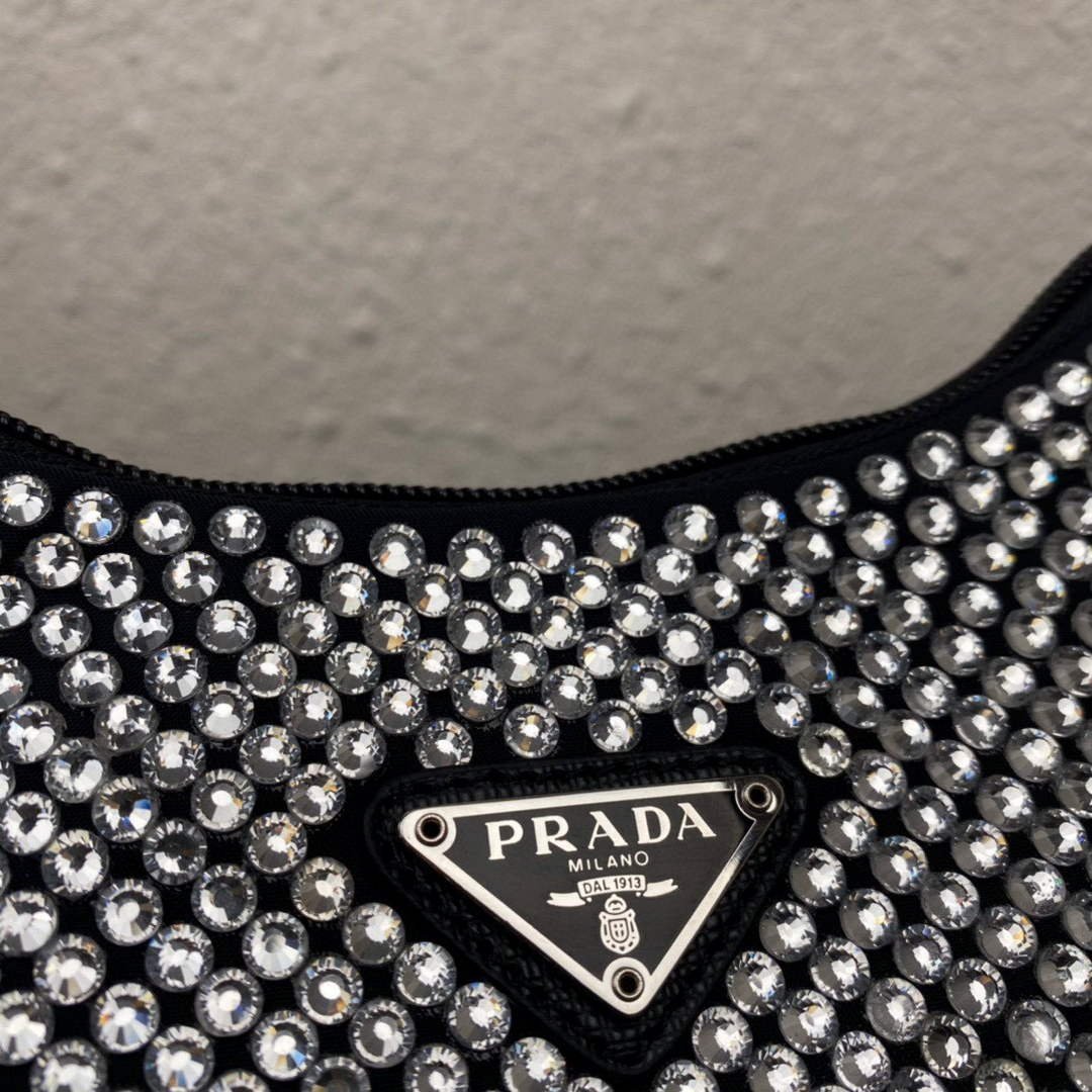 This mini hobo bag. an iconic Prada style. comes in a luxurious satin version studded with crystals and decorated with the emblematic enamel triangle logo.