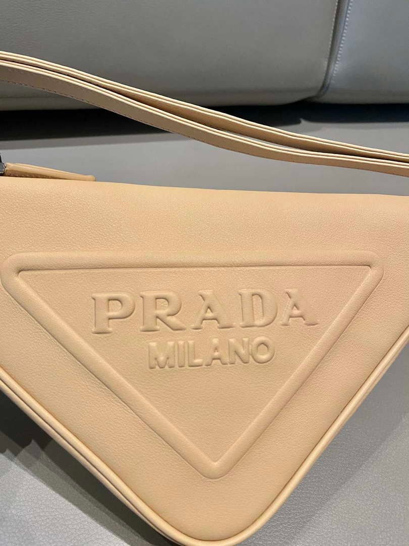 Prada 1NQ043 Triangle leather pouch Apricot on sale now.