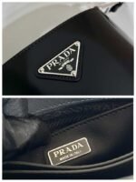 The bucket bag. a recurring design in Prada collections. comes in a mini version with modern allure. decorated with the enameled metal triangle logo and accented with a leather shoulder strap so it can be worn as a cross-body or shoulder bag. Fine brushed leather with its distinctive lustrous finish has been reinterpreted by Prada since the ’90s on unexpected designs for a hybrid result that reflects the duality of the brand.
