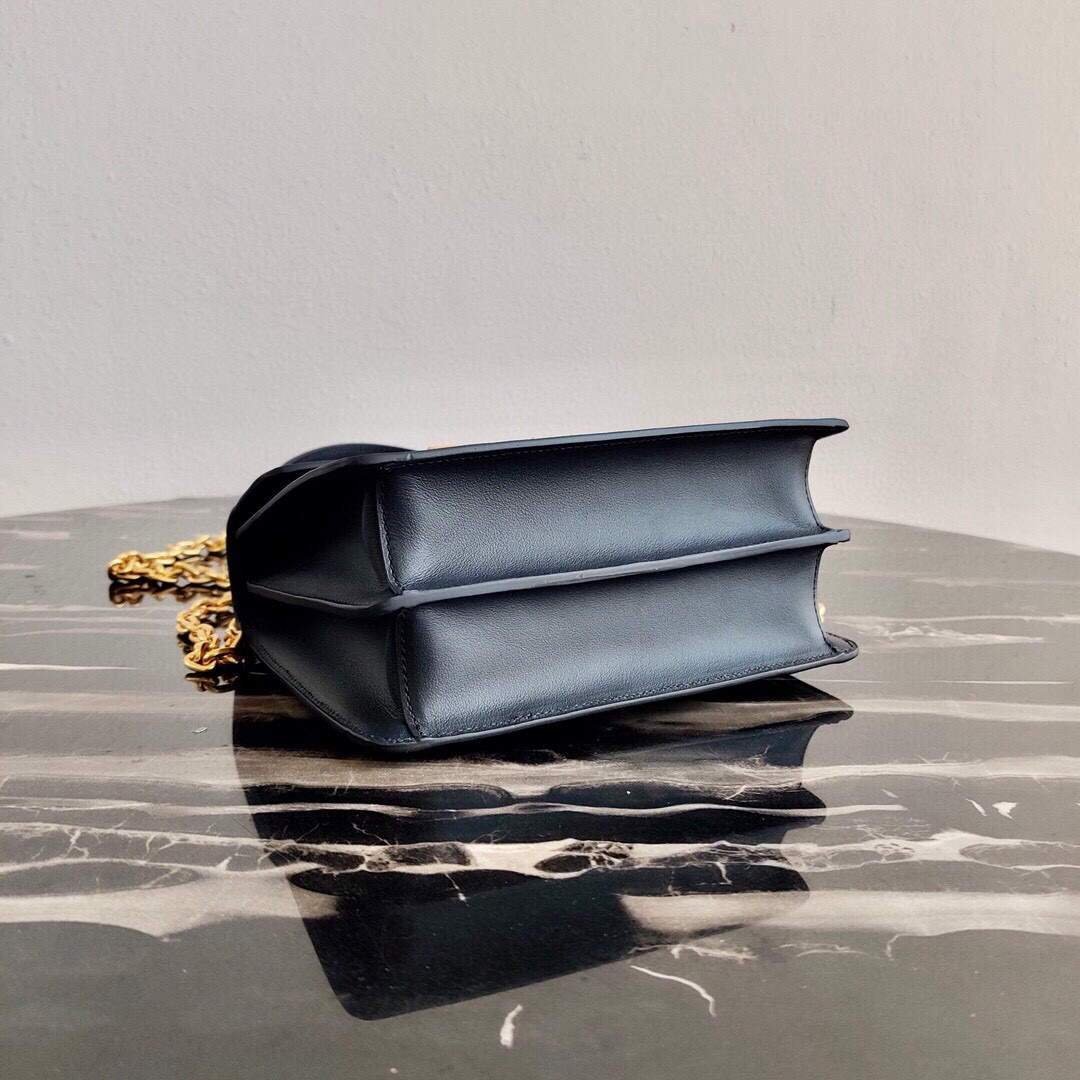 The sleek. formal line of this Saffiano leather handbag is animated with sophisticated details such as the distinctive metal triangle logo on the clasp. The bag has a chain shoulder strap with leather shoulder pad.