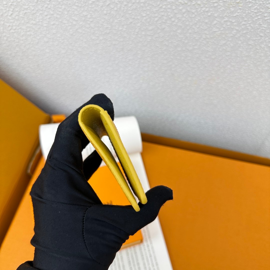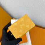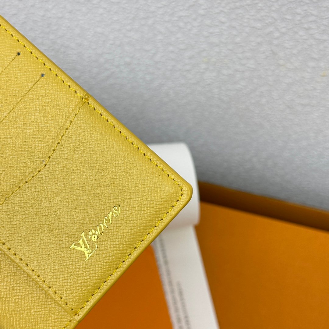 M12659 Yellow! Pocket wallet. This pocket wallet is made of Monogram Heritage coated canvas. It incorporates classic elements such as the vertical and horizontal textures of Damier check and the Marque L.Vuitton Déposée logo, showing Pharrell Williams’ modern interpretation of the Monogram pattern. 11.x 7.5