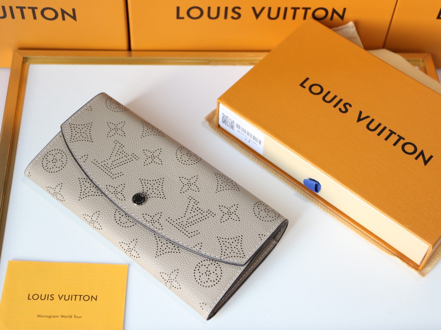 M60177/M60145/M60144/M60143 This delicate Iris wallet is sewn in Mahina calfskin, which is extra soft to the touch, and is adorned with a detailed Monogram punched flower pattern. The soft curved flip opens to reveal two large wide compartments, a zip change compartment and multiple credit card interlayers. The wallet is known for its delicate details, such as silver engraved snaps. size: 19 * 12 * 2cm