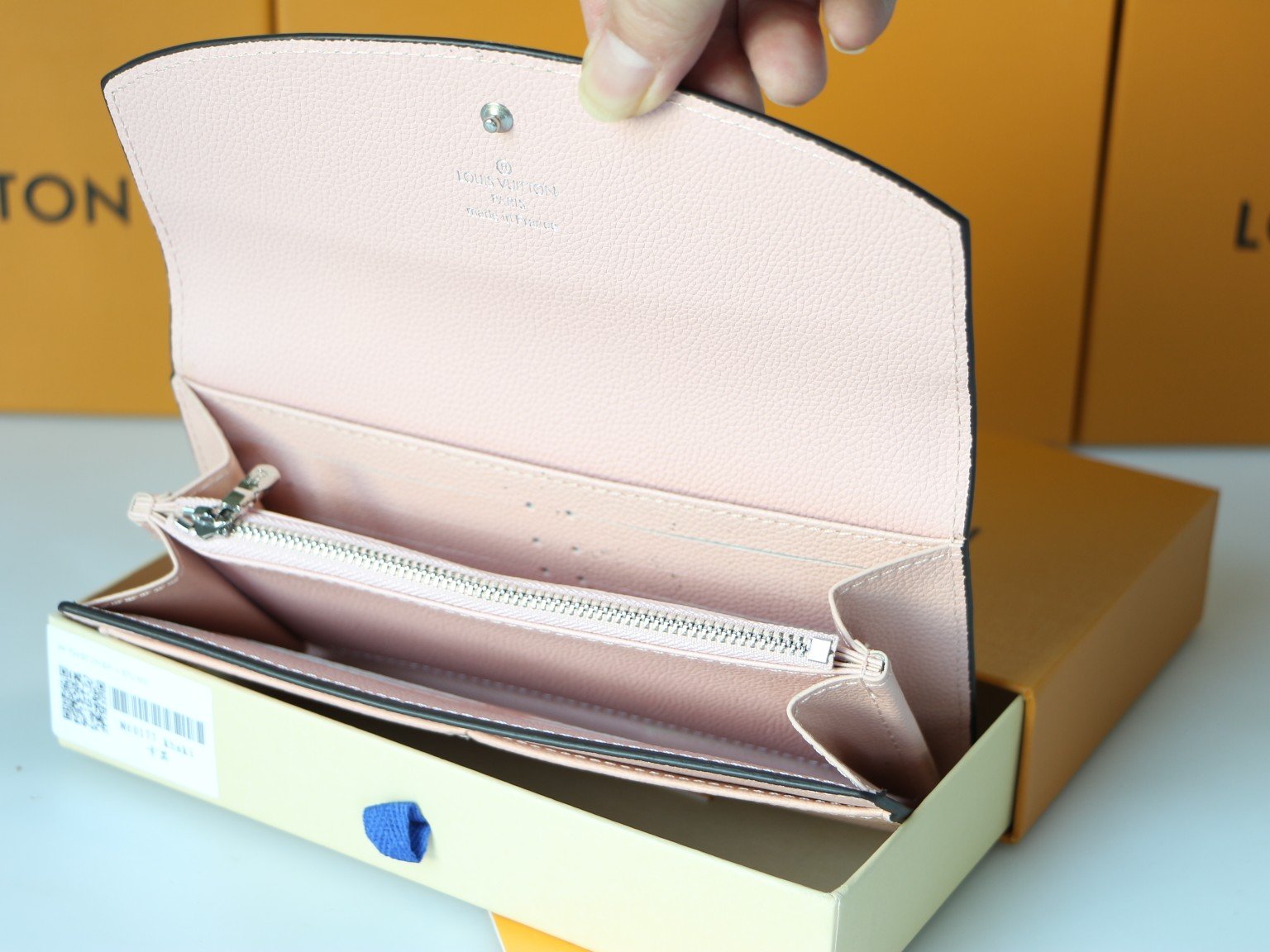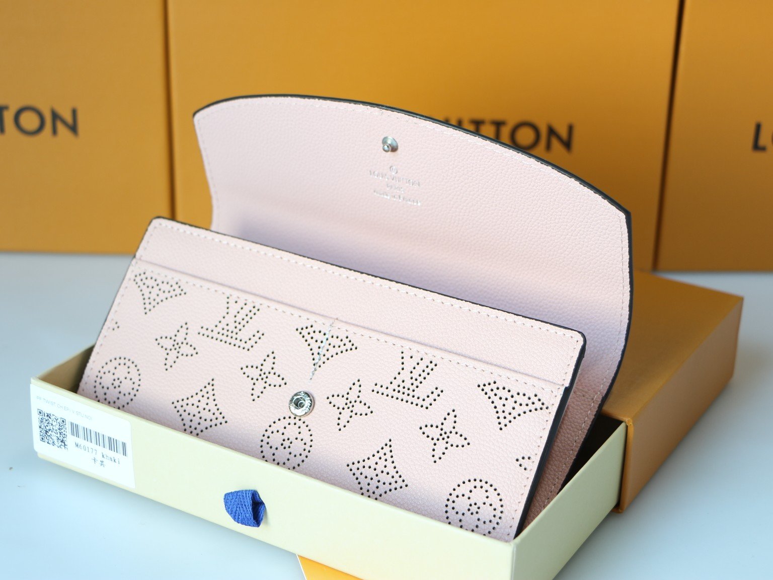 M60177/M60145/M60144/M60143 This delicate Iris wallet is sewn in Mahina calfskin, which is extra soft to the touch, and is adorned with a detailed Monogram punched flower pattern. The soft curved flip opens to reveal two large wide compartments, a zip change compartment and multiple credit card interlayers. The wallet is known for its delicate details, such as silver engraved snaps. size: 19 * 12 * 2cm