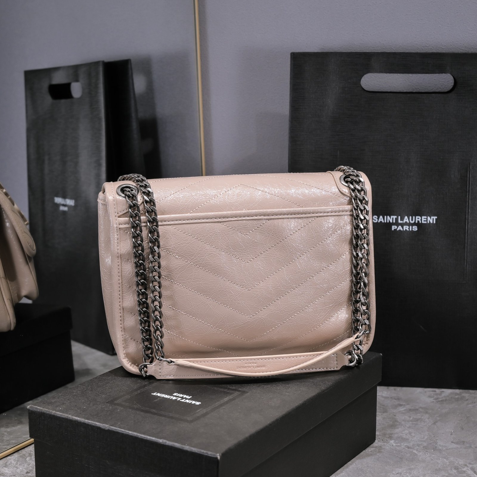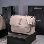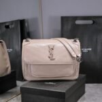 Large Saint Laurent Niki messenger bag – top Italian two-tone baked tar cowhide paired with vintage hardware. The texture and gloss are very unique! The hardware is even more special. The surface of the hardware LOGO is wrapped in cowhide! Two compartments, one zipper pocket, super large capacity! The oiled wax leather of the bag body is extremely soft to the touch and can be bent at will without any problem. Model: 498894. Size: 28x20x8cm.